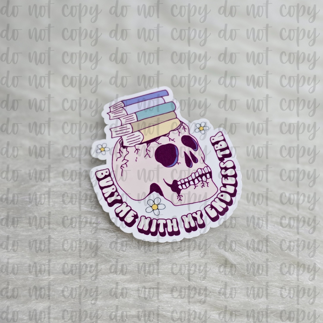 Add some quirky bookish humor to your life with the Bury Me With My Endless TBR Sticker! Measuring 2.5" at its widest point, this sticker is perfect for book lovers who never seem to run out of books to read. (Don't worry, in this case, TBR stands for "To Be Read.")