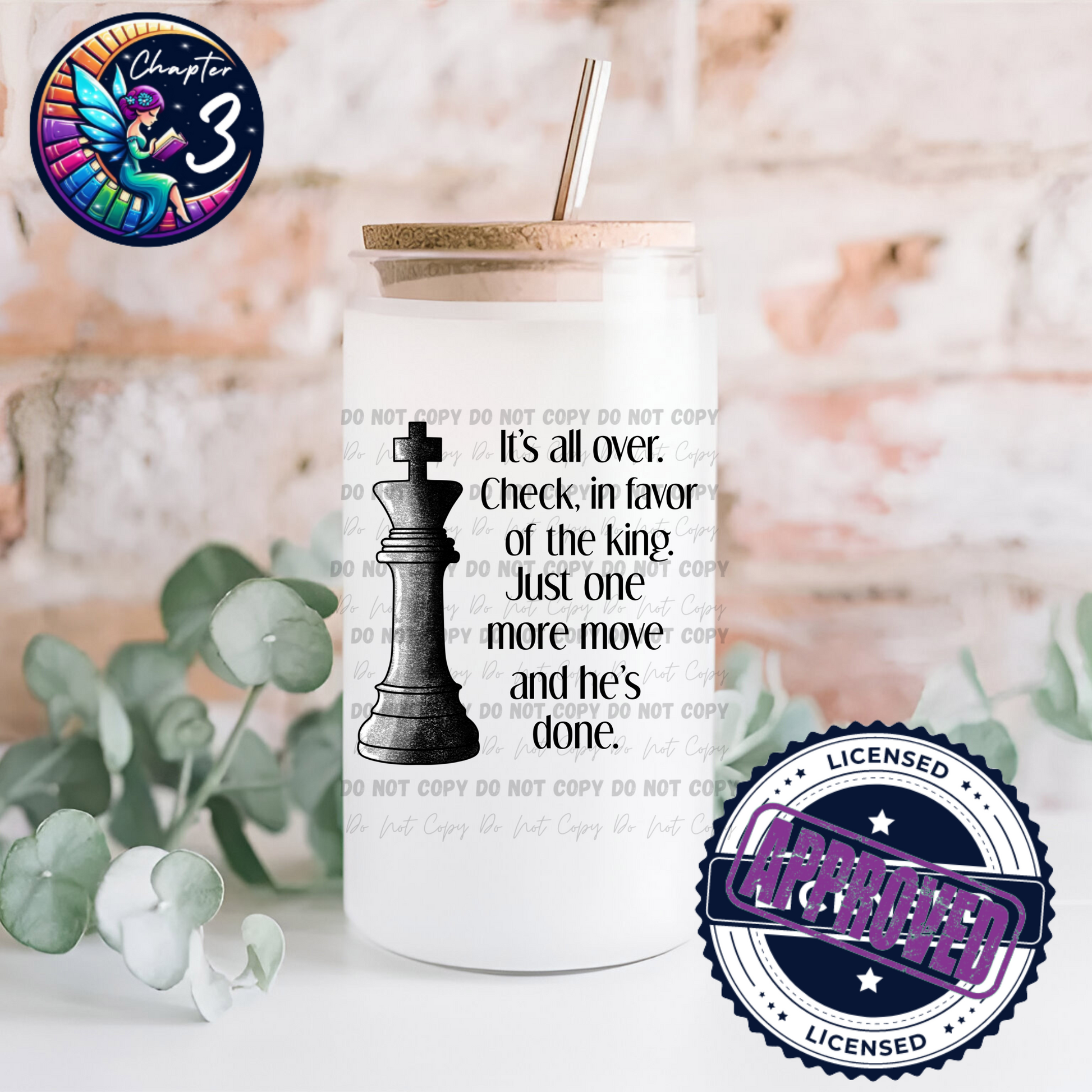 Add a regal touch to your reading experience with the "Check, In Favor Of The King" Libbey Glass Can. Inspired by Kate Stewart's "The Ravenhood", this 16oz glass can lets you quench your thirst for knowledge in style while showing off your bookish side. Cheers to literary royalty!