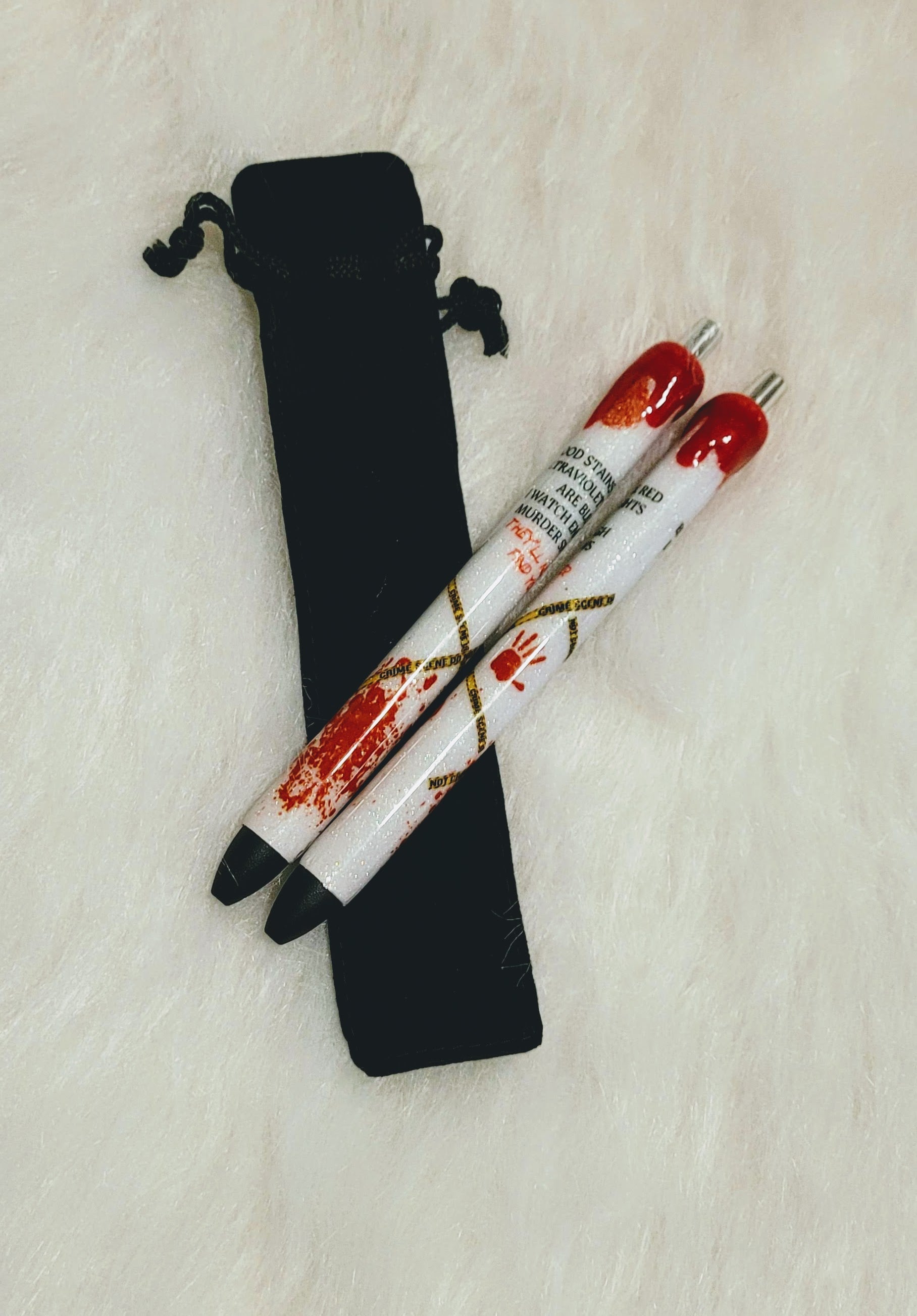 Crime Scene Drip refillable glitter pen. All pens come in their own individual velvet satchel bag, perfect for gift giving.