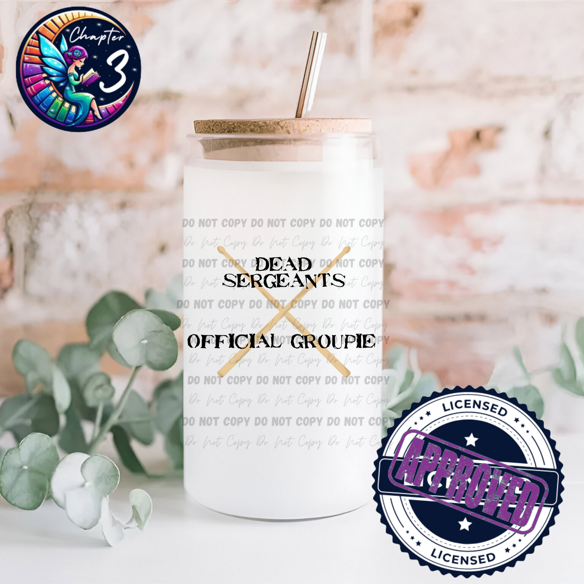Be a true Dead Sergeants Official Groupie with this 16oz Libbey glass can. Inspired by Kate Stewart's book "Drive", this bookish cup will bring your fandom to the next level. Perfect for enjoying your favorite drink while reading or as a quirky addition to your glassware collection. (Warning: may cause major book fangirling!)