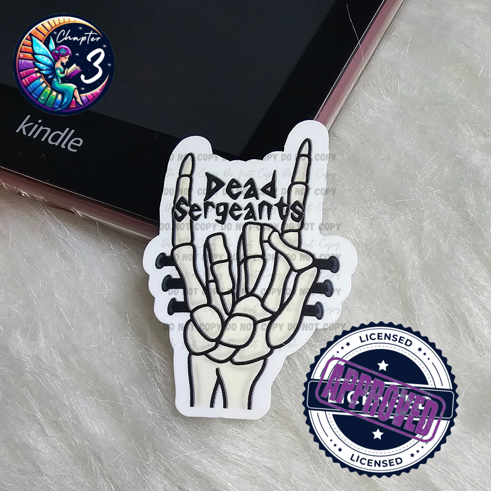 Get your groove on with the Dead Sergeants Rock On Sticker! This 2.5" sticker features a hand drawn rocking skellie hand guitar, perfect for adding a touch of personality to your belongings. Show off your playful side with this quirky sticker. (Note: may cause uncontrollable toe-tapping or day dreaming of Reid Corwne.)
