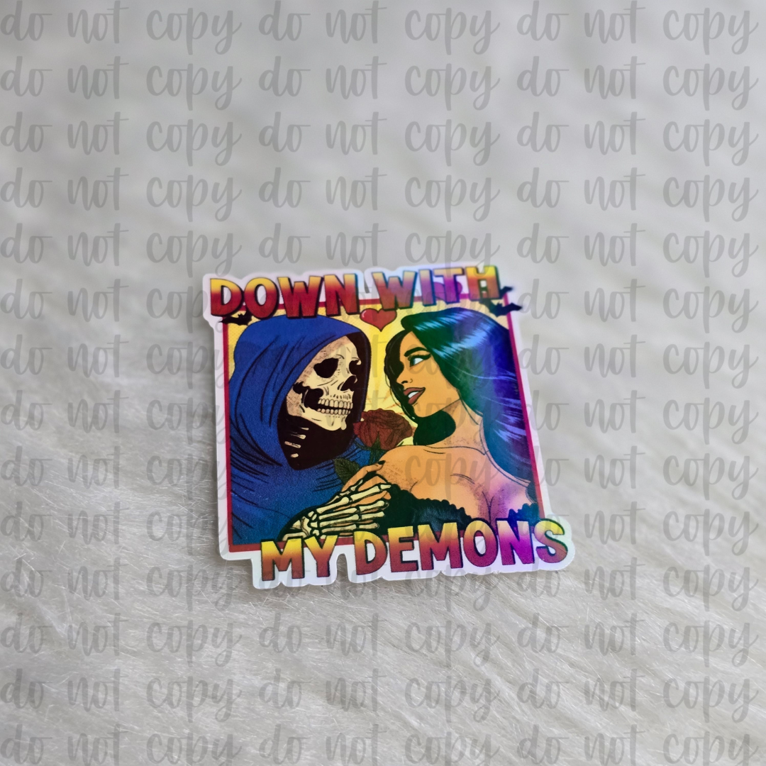 Embrace your dark side with our Down With My Demons sticker! Measuring 2.5" at its widest point, this dark romance sticker can come with or without words. Show the world you won't back down from your inner and outer demons. ;)