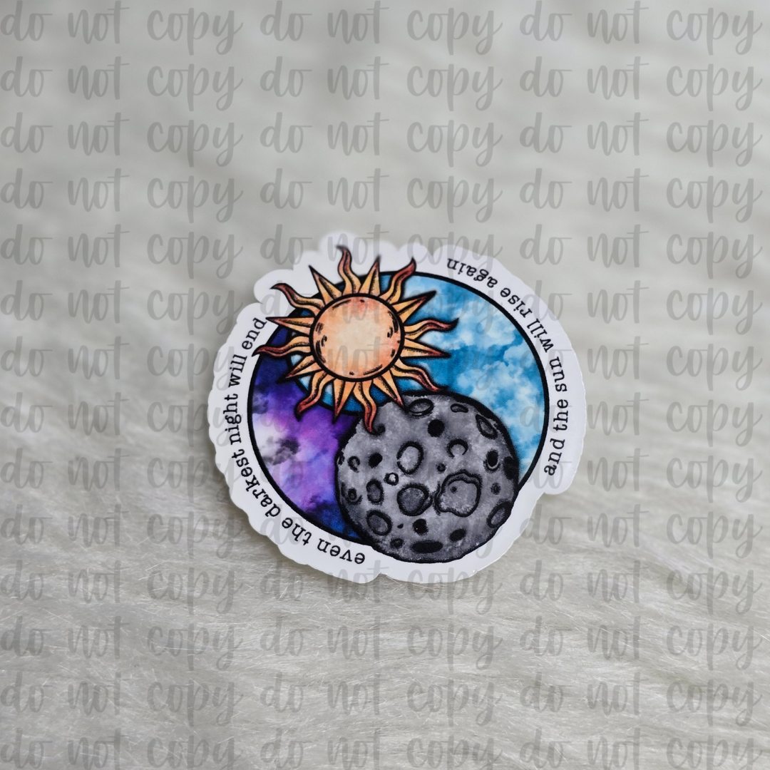 Brighten up any surface with our "Even The Darkest Night Will End" sticker! Measuring 2.5" at its widest point, this sticker is a daily reminder that even tough times will pass and better days are ahead. Spread positivity and keep going with this quirky and playful sticker!
