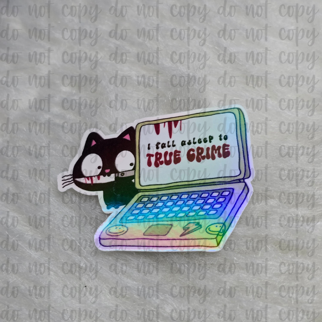 Crime enthusiasts, this one's for you! Our I Fall Asleep To True Crime Sticker (2.5" wide) is perfect for decorating your laptop, water bottle, or notebook. Show off your love for true crime in a quirky and playful way. Sweet dreams and darker minds await you!