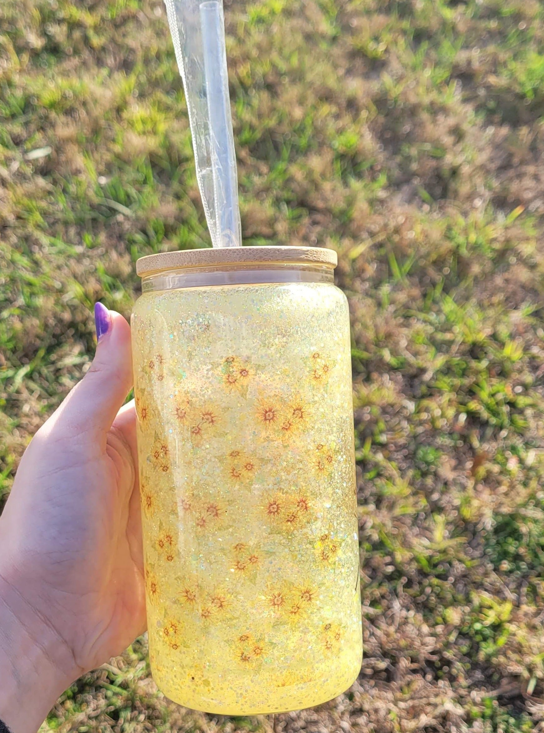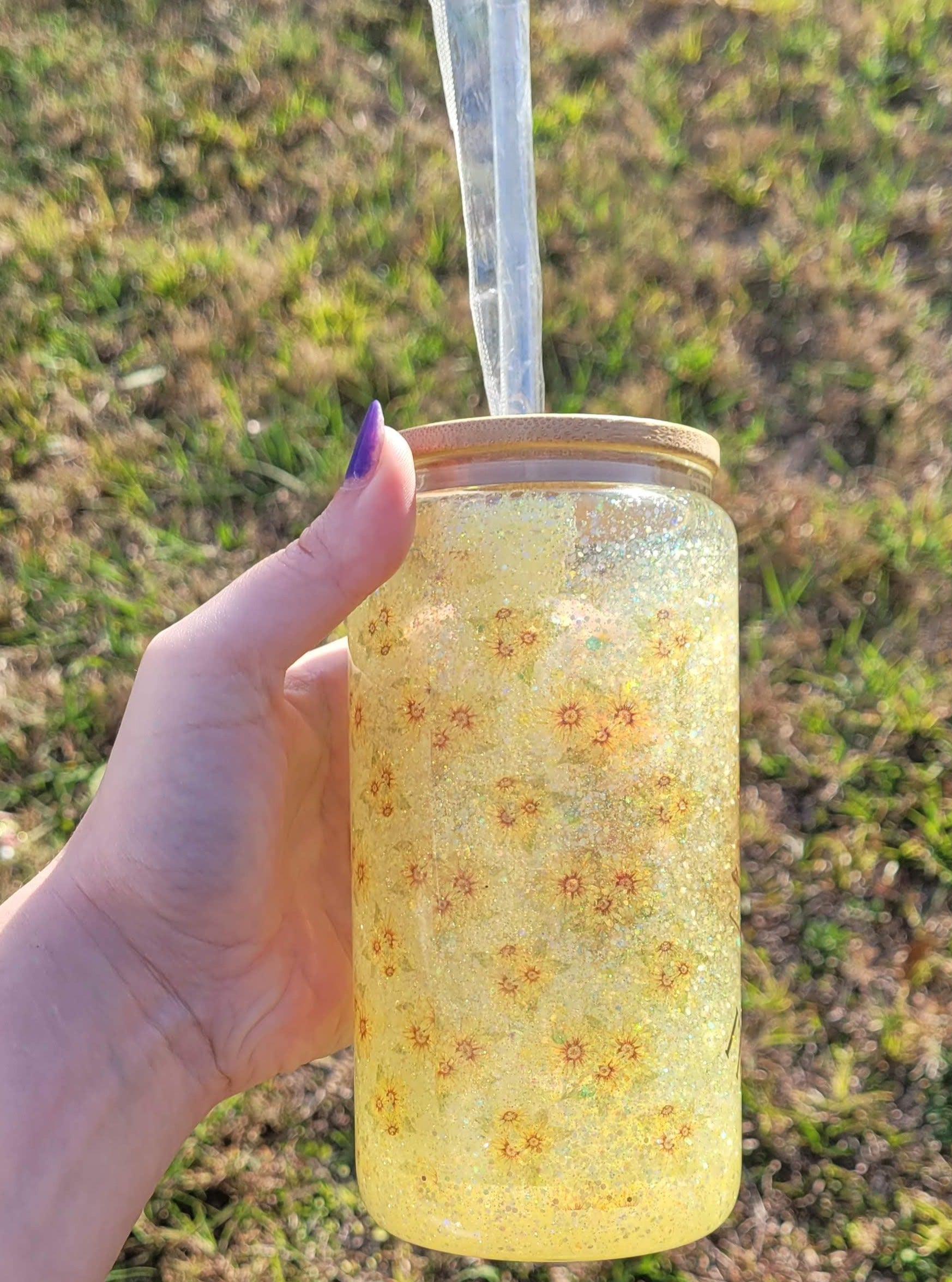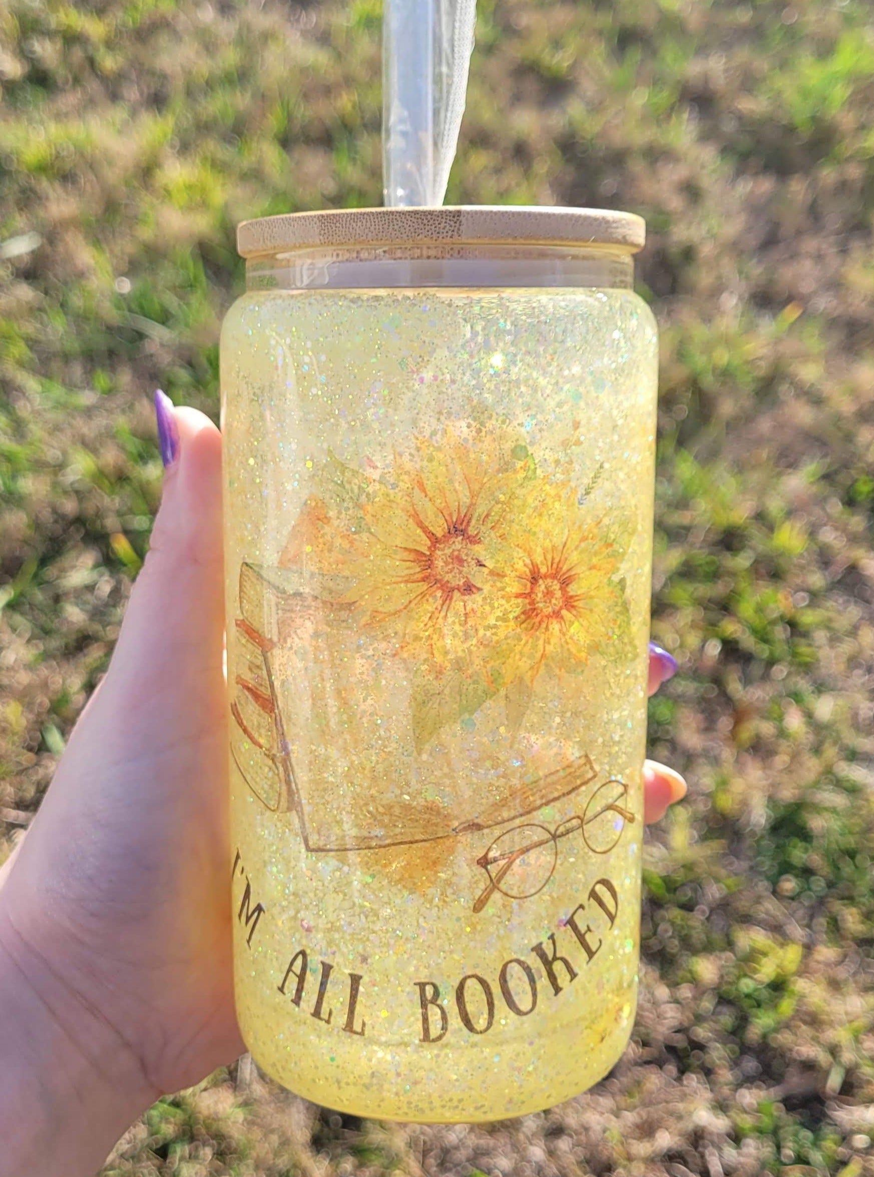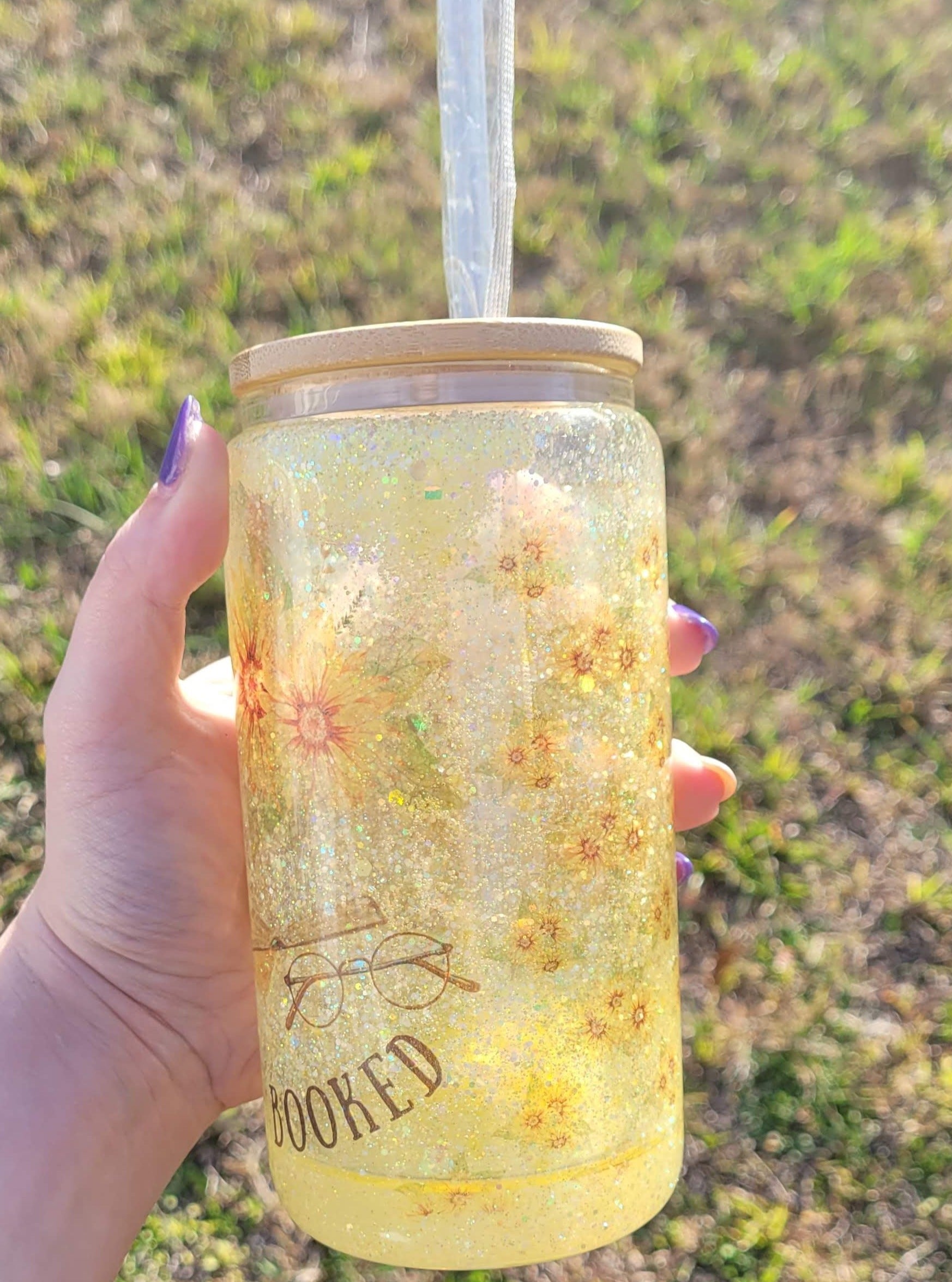 This Libbey Glass Can features an I'm All Booked Sunflower Snow Globe design, complete with glitter, Bamboo lid, and reusable plastic straw.