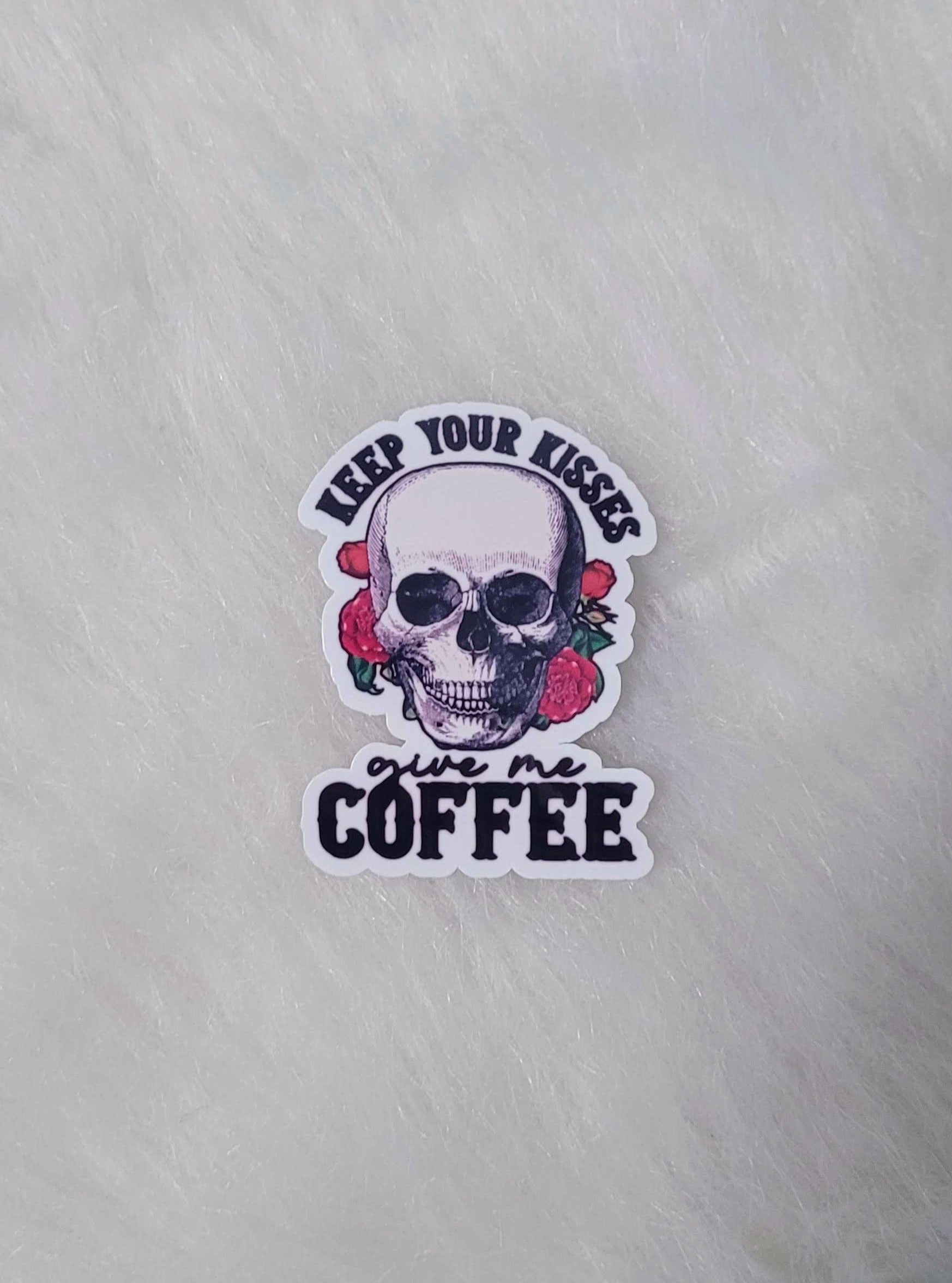 All stickers are 2" wide at largest side. Keep Your Kisses and Give Me Coffee Skull and Roses Sticker