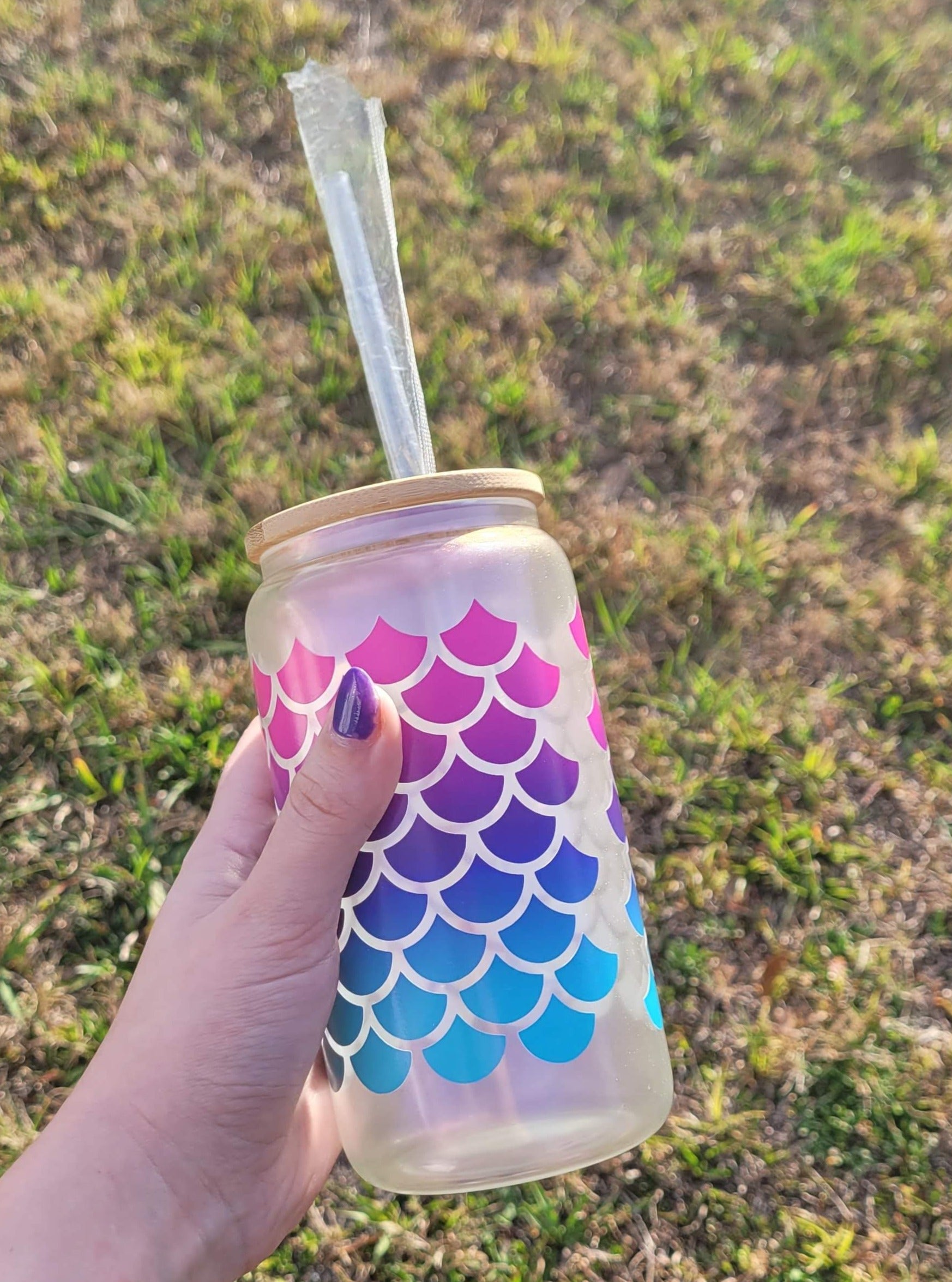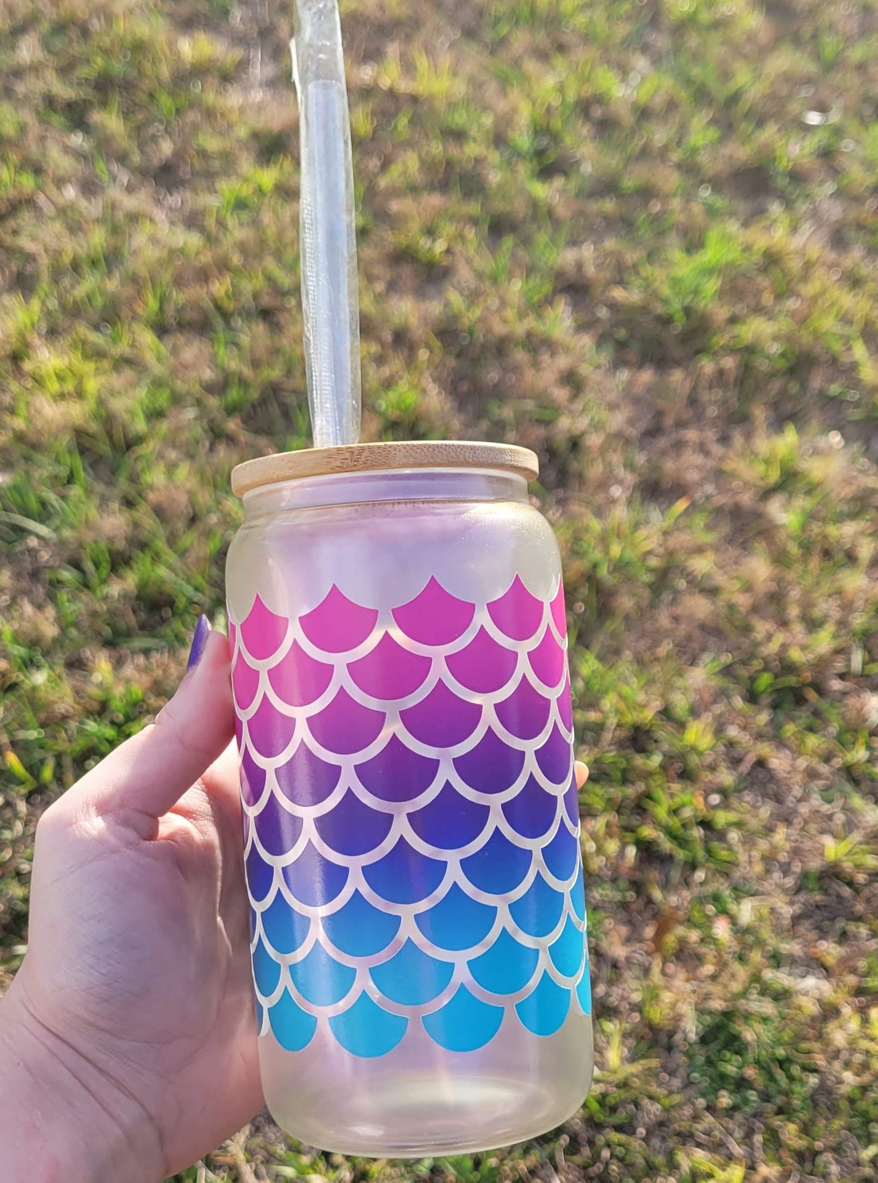 This 16oz glass can offers a unique, shimmering mermaid ombre scale look.