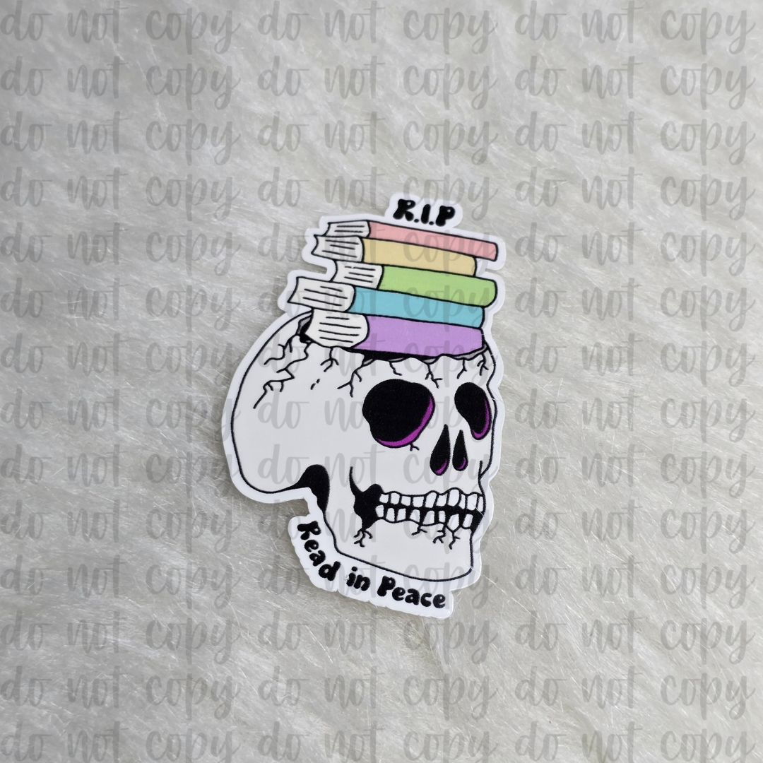 Add some quirky flair to your reading nook with our "Read In Peace" sticker! Featuring a skull design measuring 2.5" wide, this sticker lets everyone know that books are life and reading is sacred. Perfect for book lovers and anyone who wants to make a statement with their decor.