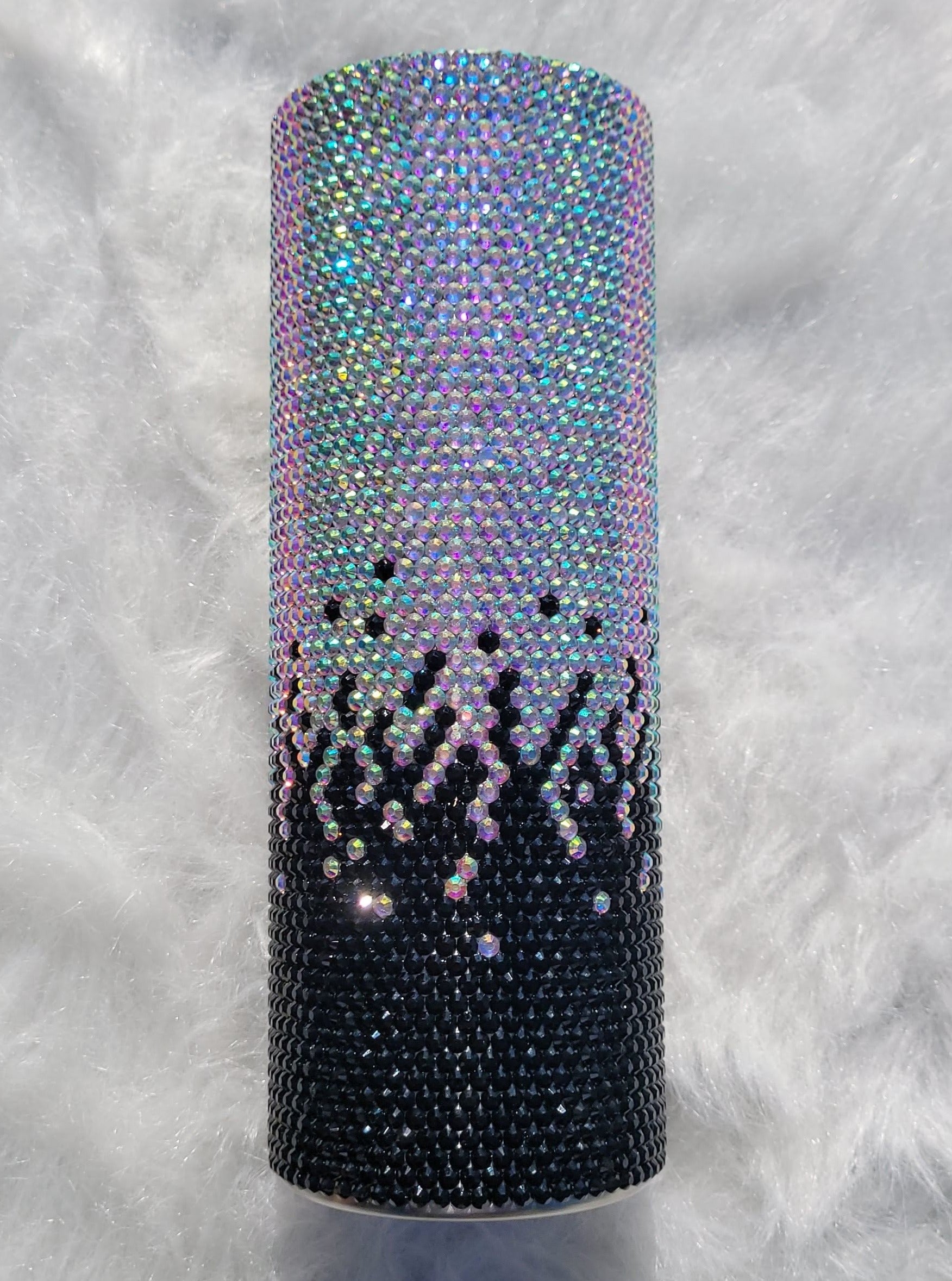 This stainless steel tumbler features a unique silver holographic design complemented by a black ombre-style rhinestone finish.