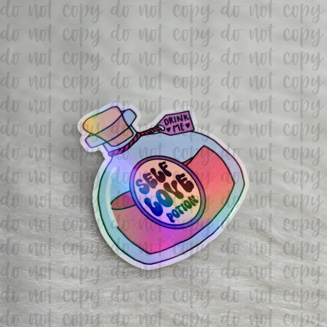 Spread some self-love with our Self Love Potion sticker! Measuring at 2.5" wide, this quirky sticker is perfect for adding a touch of self-care to your belongings. Show off your playful side and use this sticker as a reminder to love yourself in a fun and unique way.