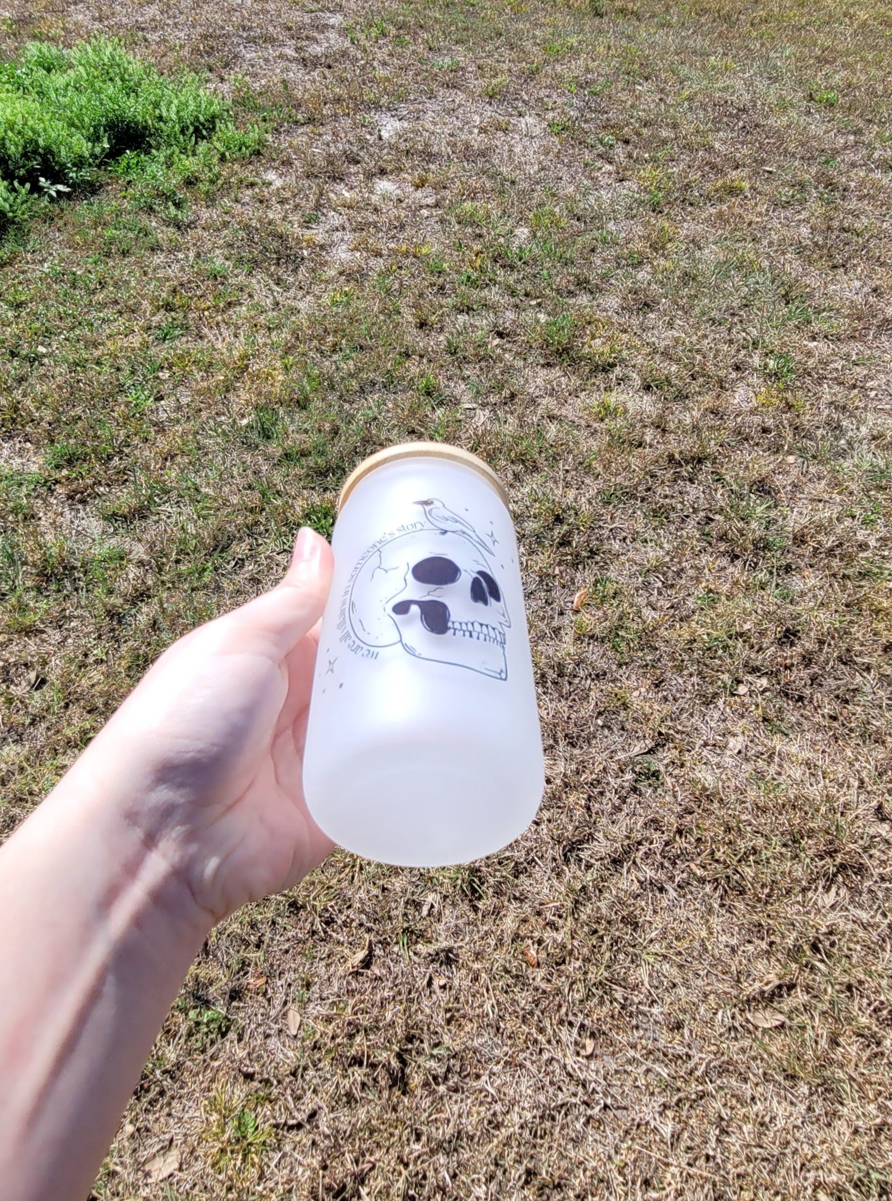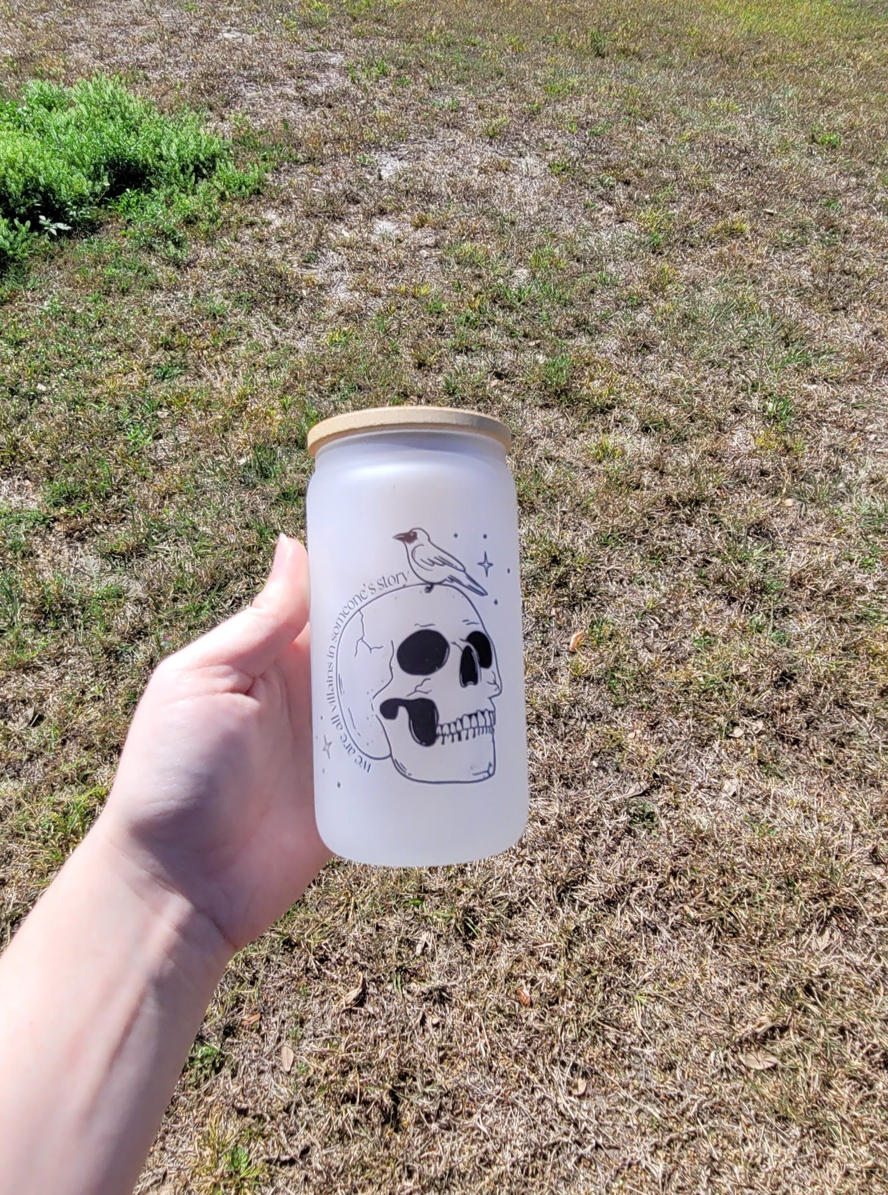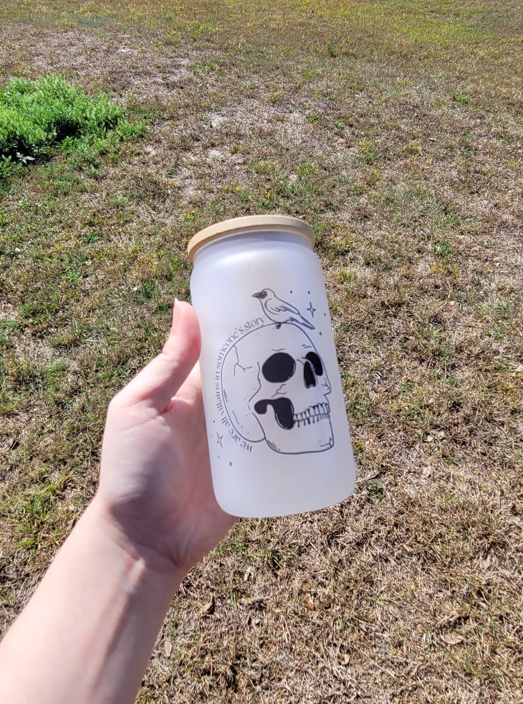 This glass can displays the thought-provoking artwork of 'We Are All Villains In Someone's Story,' making it an ideal container for drinks.
