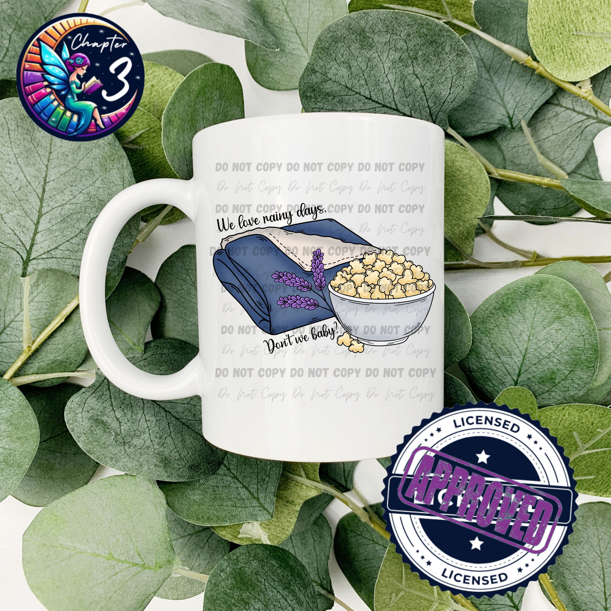Embrace gloomy days with our "We Love Rainy Days, Don't We Baby?" mug, inspired by "The Ravenhood" book series by Kate Stewart. Perfect for bookish souls. 15oz capacity.