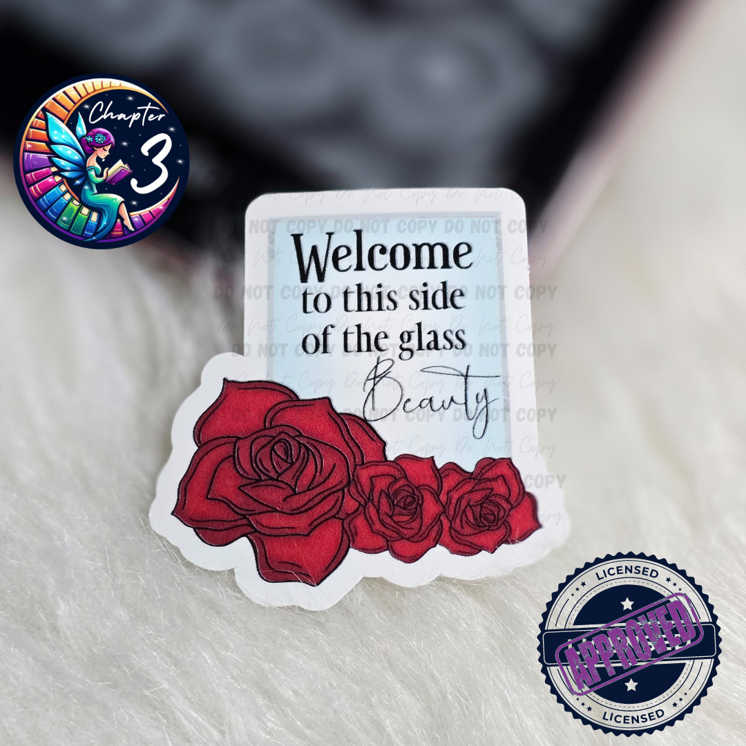 Welcome to your new obsession! The "Welcome to This Side of the Glass" sticker is not your average beauty sticker. Measuring at 2.5" at its widest point, it's the perfect size to add a touch of whimsy to any book or notebook. Embrace your love for all things bookish with this Reverse inspired sticker.