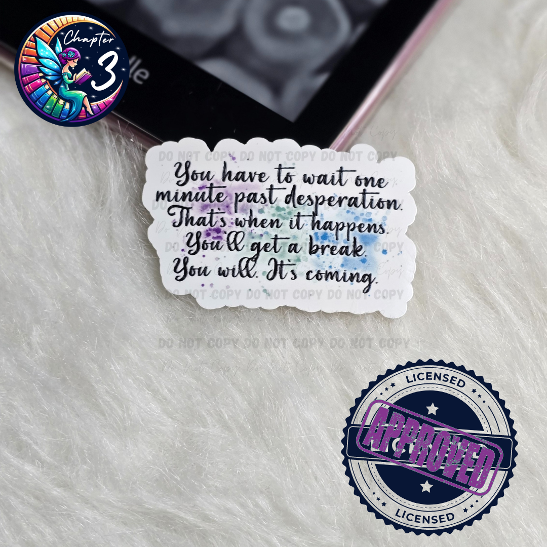 Get through tough times with our "You Have To Wait One Minute Past Desperation" sticker! Trust us, a break is coming (stickers not guaranteed to bring actual breaks). At 2.5" wide, it's the perfect size for your laptop, water bottle, or whatever you need to stick it to!