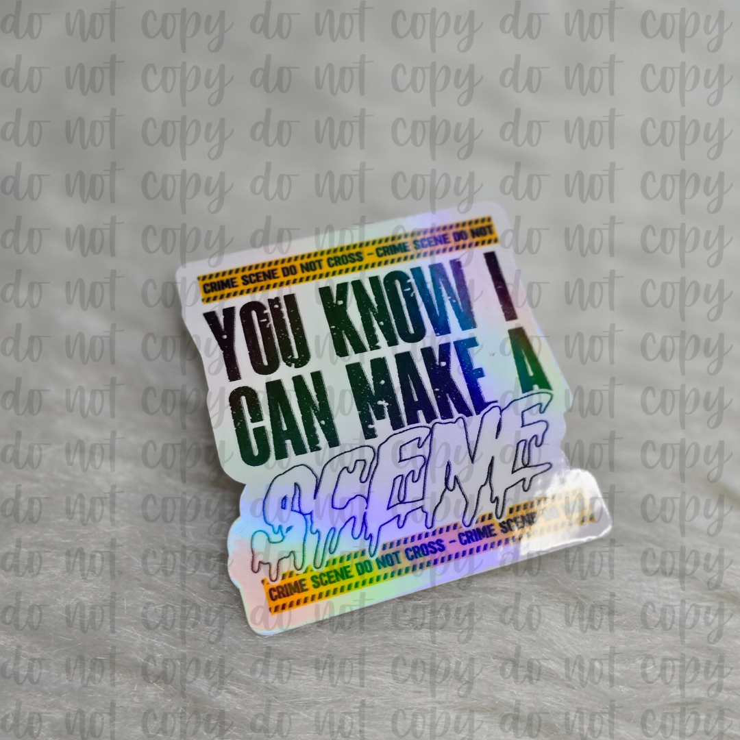 Cause a stir wherever you go with the "You Know I Can Make A Scene" sticker! Featuring quirky word play and measuring 2.5", this sticker adds a playful touch to any item. Let your unique personality shine through with this fun and humorous sticker.