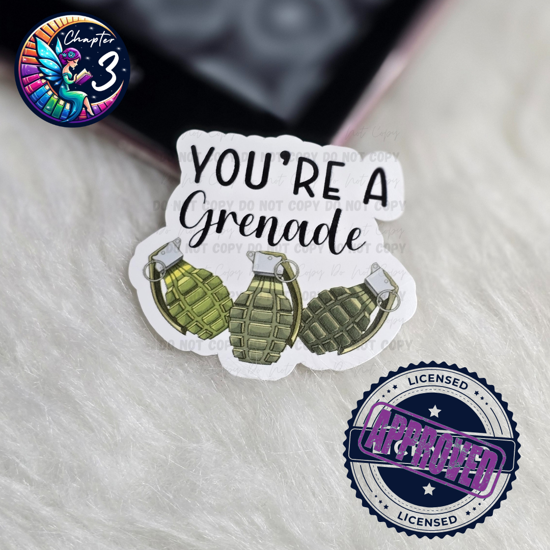 Explosively show off your personality with our "You're a Grenade" sticker! Measuring 2.5" at its widest point, this playful sticker adds a bold touch to any surface. Don't be afraid to make a statement with this unique addition to your collection. (BOOM!)